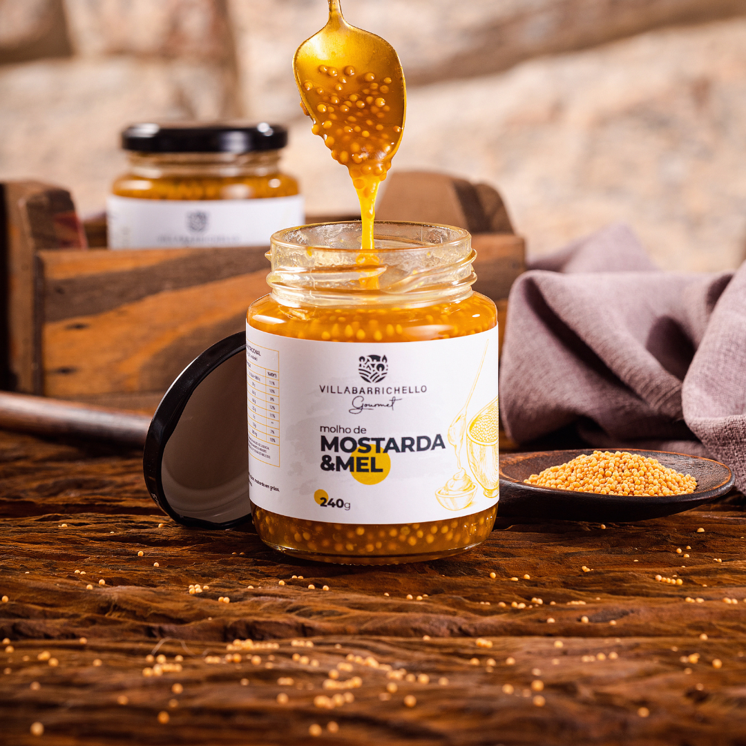 Ingredientes: Mel, açúcar, mostarda amarela, água, mostarda em grãos, vinagre de framboesa, sal, ácido cítrico.